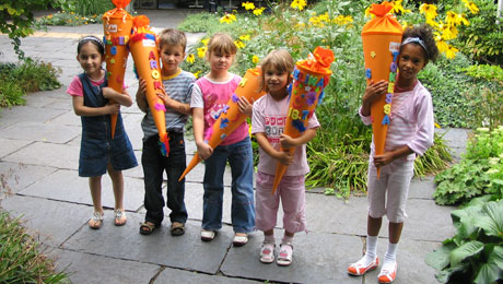 Die Zuckertüten wurden an insgesamt drei Bastelnachmittagen von den Kindern mit viel Fantasie und tollen Ideen gestaltet. Mit Verkehrszeichen und Tieren, mit Buchstaben und Zahlen, mit Herzen und Schmetterlingen, mit Sonne, Mond und Sternchen und natürlich Federn verziert, leuchteten die Tüten mit den Augen der Kinder am Ende der Bastelstunden um die Wette. | ![]() |