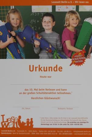 Dank Unterstützung von der Stiftung Berliner Sparkasse und der Deutsche Wohnen AG können sich wieder alle Kinder, die im Sommer eingeschult werden, mit dem Besuch von 10 Vorlesestunden ihre eigene Schultüte „erlesen“. Das Projekt wurde bereits in den Jahren 2008 -2012 erfolgreich durchgeführt. Am Ablauf hat sich nichts geändert: