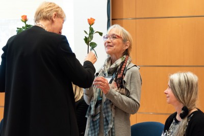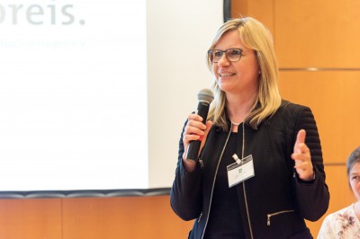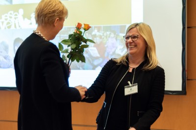 Ursula Frommholz nutzte die Dankesrede, um darauf aufmerksam zu machen, dass die staatlichen Bildungsausgaben zwar stetig steigen, aber bei den benachteiligten Kindern und denen, die sich für sie einsetzen, leider kein Geld ankommt. So kämpft der Verein aktuell ums finanzielle Überleben und sucht dringend Spender und Sponsoren! | ![]() Glückwünsche an Katrin Müller |