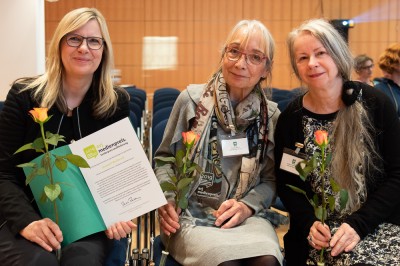 Seit dem Jahr 2000 organisiert Lesewelt Berlin e.V. regelmäßig Vorlesestunden für Kinder im Alter von vier bis zwölf Jahren in ganz Berlin und ist damit ein Pionier unter Deutschlands Vorleseinitiativen und bislang konnten 160.000 kleine Besucher auf spannende Leseabenteuer mitgenommen werden. Lesewelt Berlin ist ein wunderbares Beispiel für bürgerschaftliches Engagement, das im Kleinen begonnen hat und -zu Recht -immer mehr Aufmerksamkeit bekommt und noch mehr bekommen sollte.” “Ich freue mich sehr, dass vor mir zwei Damen stehen, die sich voller Leidenschaft für die Leseförderung einsetzen”, sagte Laudatorin Renate Reichstein. “Wer sich auf der Homepage umschaut und sieht, mit welchen Aktivitäten Frau Müller und Frau Frommholz das Buch an das Kind bringen, wird verstehen, warum die Lesewelt den Preis erhalten hat − auch wenn ihn alle Kandidaten der Longlist verdient hätten.” | ![]() Glückwünsche an Ursula Frommholz |
